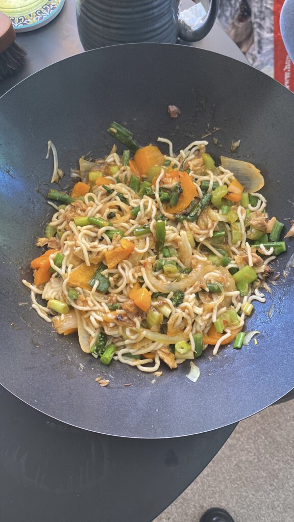 - Mixed vegetables (your choice) We chose some spring onions and green veg and some yellow peppers for the base but you can have variations – it’s up to you and your preferences.